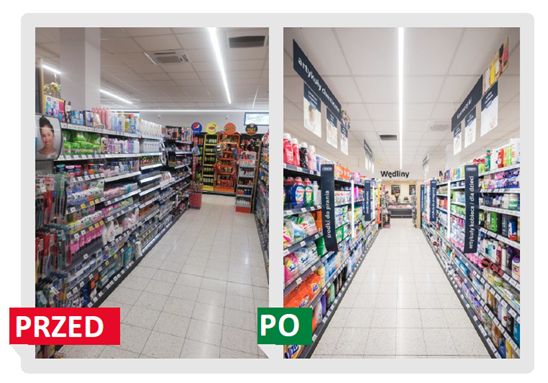 Dodatkowo dbamy o przyjazny wygląd alejki montując podwieszane plansze z kategoriami chemia, higiena, kosmetyki, podświetlane shelfstopery z opisami kategorii oraz oświetlenie wyróżniające alejkę na tle całości sklepu. Nie brakuje też dobrze widocznych informacji o bieżących promocjach. Zobacz efekty naszej pracy na przykładzie sklepu w Międzyrzeczu: